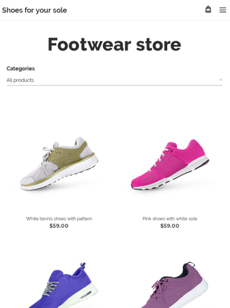 Let the customers of your shoe store shop online with our brand new template. Organize your products into categories, add descriptions and sell them in no time in your brand new online store.