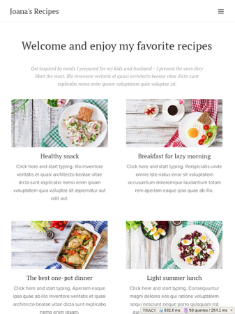 Pick this template for your blog about travelling, cooking, fashion and healthy lifestyle. Your travel pictures, culinary delights and outfits of the day will pop right out in its well organized structure. Do not forget to fill fun facts about yourself and add a contact form.